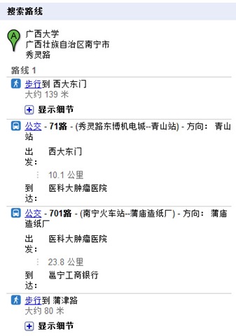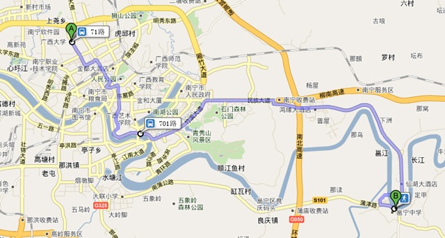 到了火车站已经是差不多快10点,在几个站牌怎么都找不到701的出发站。我们很晕,于是我拿出手机打开GoogleMap手机版打算看看。我搜索701的路线,又对比这火车站那里站牌的车次看车站,终于看到213和701有交汇点,在所谓“民族会展路口”。至此,我们终于顺利的从学校经过2次辗转,出城进村再进小县城,到了那可爱的邕宁,去看那可爱的五圣宫。